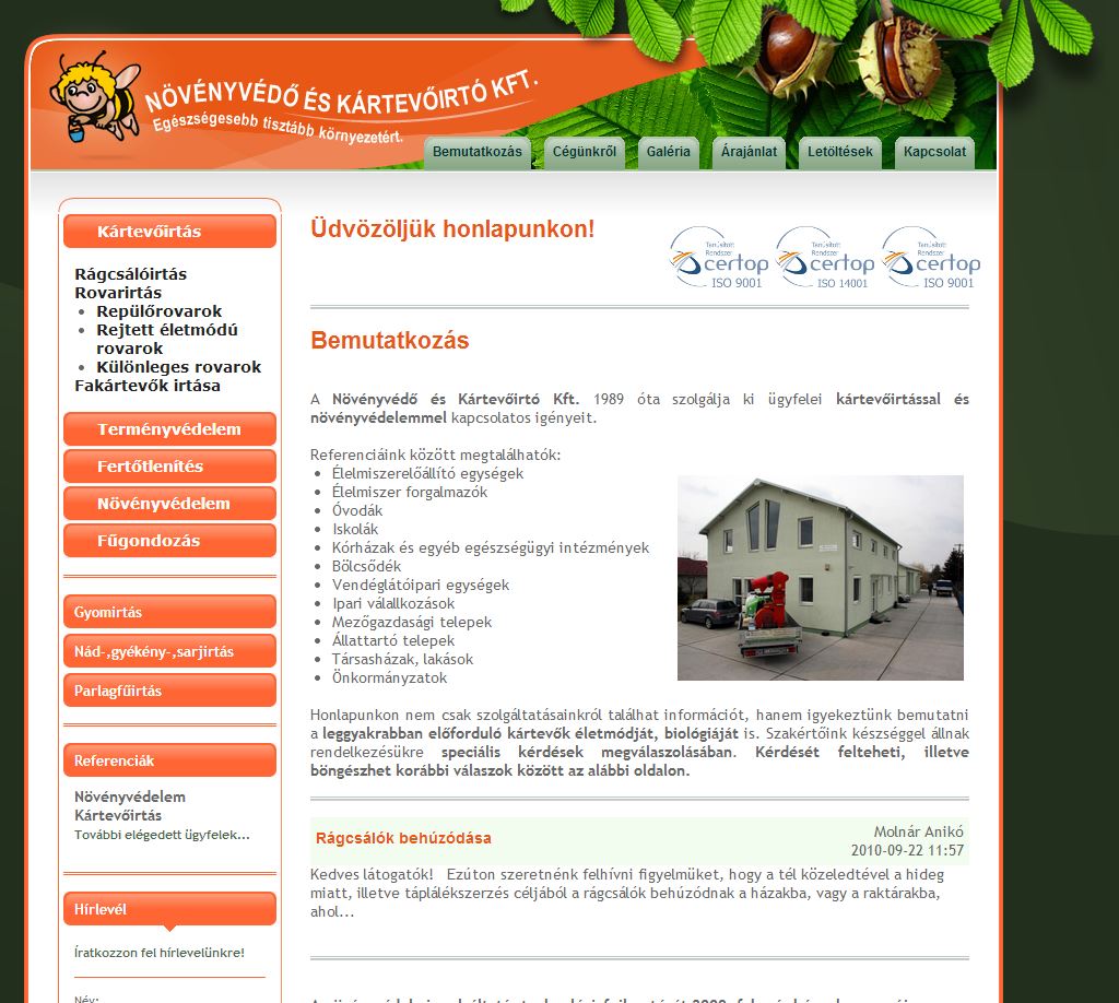 A Növényvédő és Kártevőírtó Kft. weboldala egy dinamikus weboldal a ViP-CMS rendszer által hajtva. Sok hasznos tartalmat találhatunk a honlapon a kártevőkkel kapcsolatban, és magunk is tehetünk fel kérdéseket, amelyet a szakértők megválaszolnak.