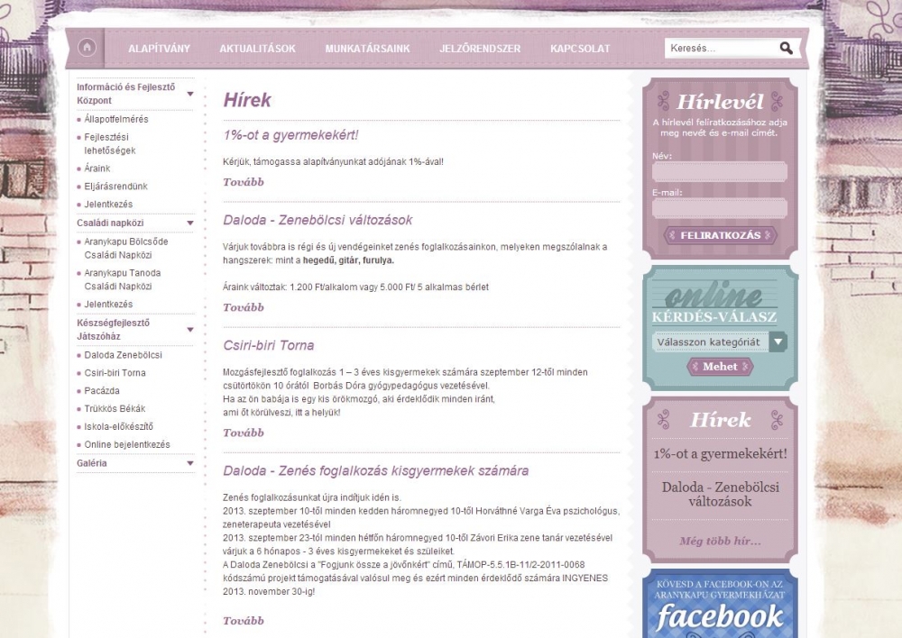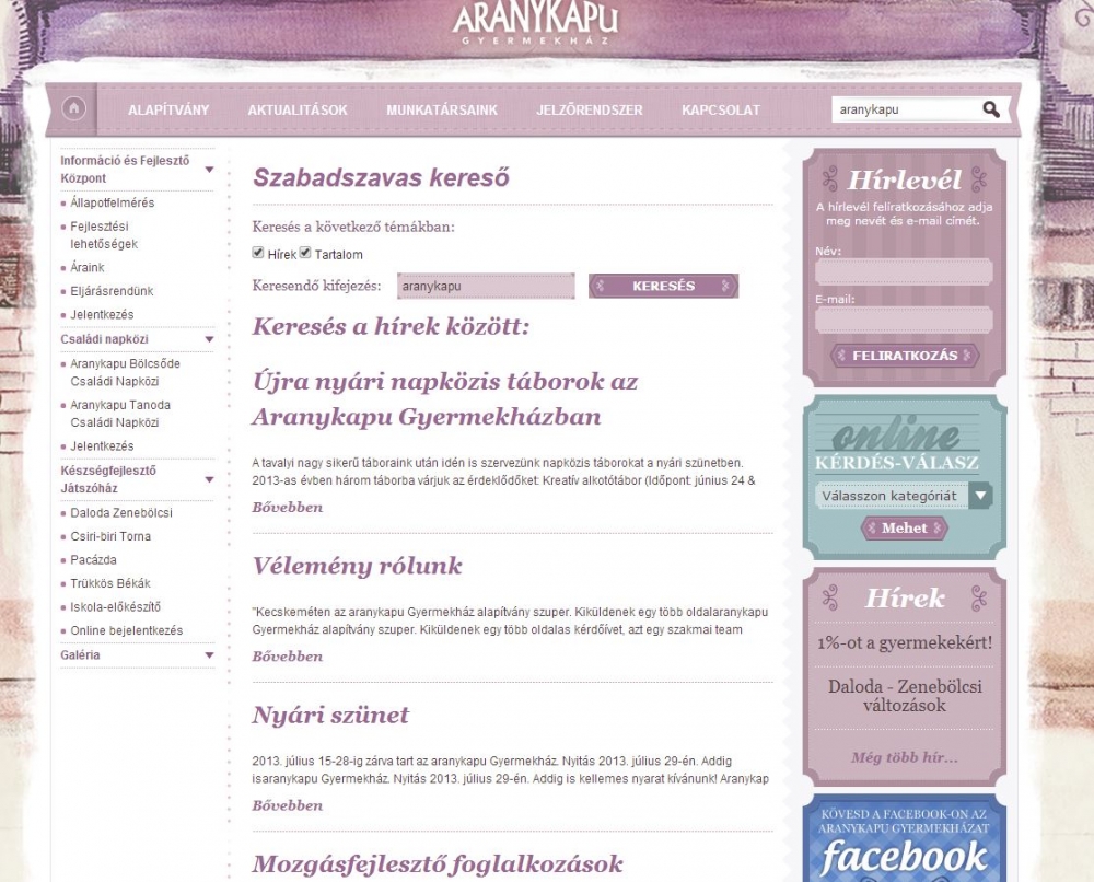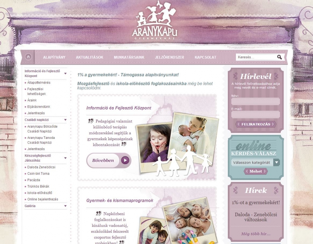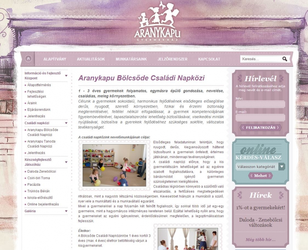 Az Aranykapu Gyermekház fenntartója az Aranykapu Gyermekházat Támogató Alapítvány, mely közhasznú, non-profit szervezet. Fogantatástól kamaszkorig nyújt segítséget gyerekeknek és szüleiknek. Családi napközit tart fenn bölcsődés és általános iskolás gyerekek számára, valamint különböző fejlesztésre szoruló gyermekek és szüleik kaphatnak szakmai támogatást. A honlapon a szinte obligát tartalom kezelő modul mellett helyet kapott a Hírlevél, a GYIK és a Kereső modul is. Az igényeknek megfelelően természetesen az Űrlap modul is integrálva lett, valamint a közösségi felületekkel (Facebook, Twitter) is összekötöttük.