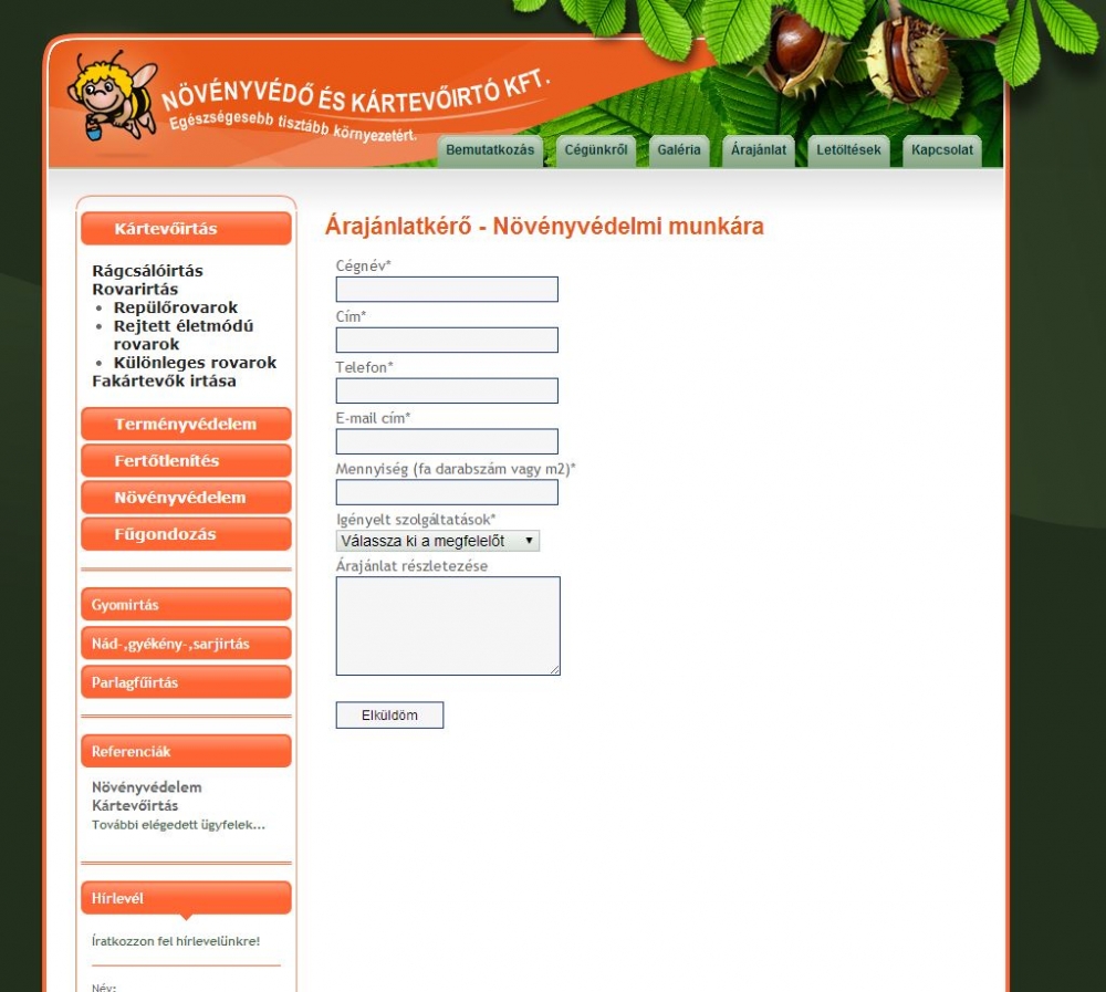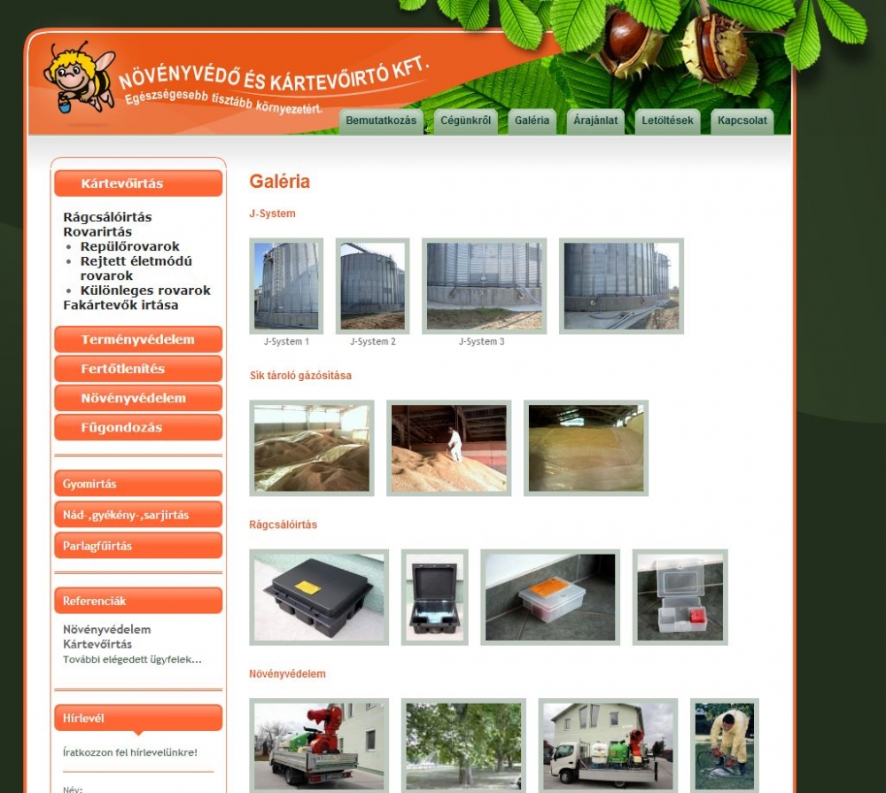 Növényvédő és Kártevőírtó Kft. weboldala egy dinamikus weboldal a ViP-CMS rendszer által hajtva. Sok hasznos tartalmat találhatunk a honlapon a kártevőkkel kapcsolatban, és magunk is tehetünk fel kérdéseket, amelyet a cég szakértői megválaszolnak. Tematikus információkat olvashatunk, árajánlatot kérhetünk, lehetőségünk van hírlevélre feliratkozni és böngészni a galériát.